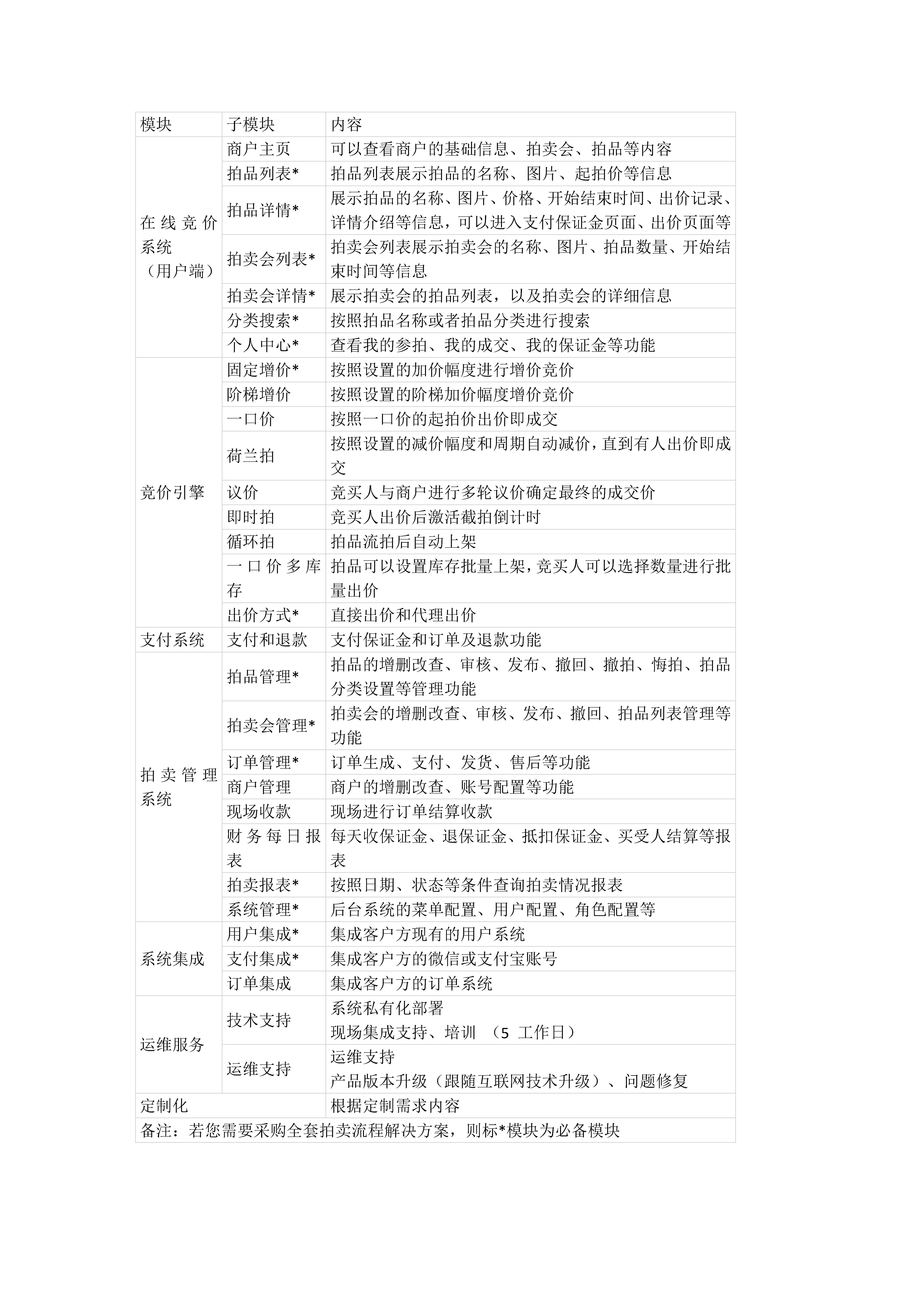 拍前的委托拍卖合同管理、拍卖公告制作和发布、拍卖会和拍品制作和发布、竞买人资质审核;拍卖中的竞价过程;拍卖后的买受人结算和委托方结算,功能齐全且全流程进行日志监控,可以满足各项监管要求。
